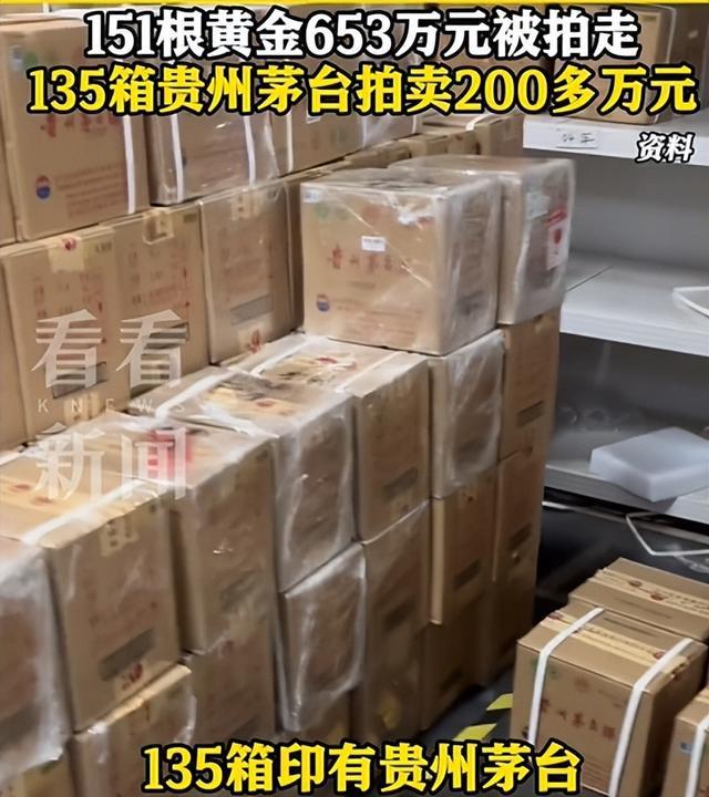 拍卖的酒则大多数为印有贵州茅台酒字样的成箱酒,其中成交价最高的单个标的为135箱印有贵州茅台酒字样纸箱酒水,成交价超200万元。