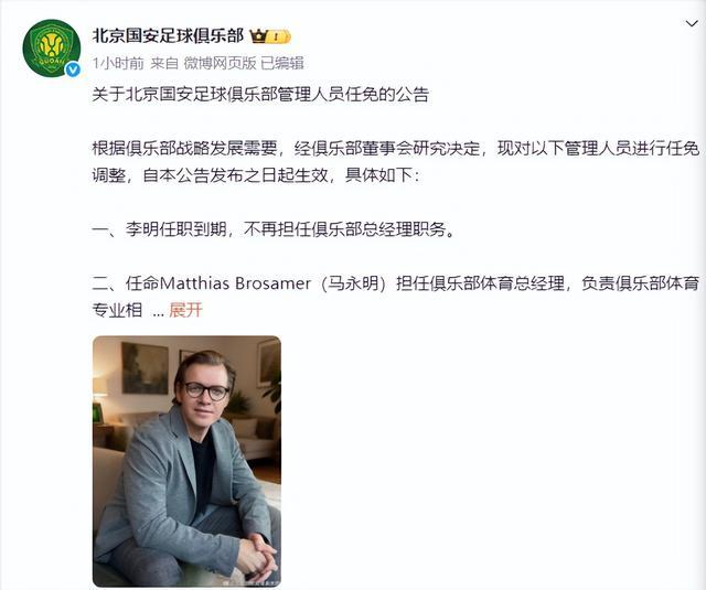 北京国安重磅人事变动,李明卸任,德国名将马永明加盟团队
