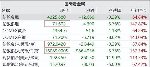 贵金属方面,截至发稿现货黄金跌0.29%,报4325美元/盎司。盘中一度大跌超1%,失守4280美元/盎司。沪金主力合约日内跌近1%,现报973元/克。现货白银大跌5%,现报71美元/盎司。现货钯金大跌5%,现报1520美元/盎司,现货铂金一度跌超12%,现报1928美元/盎司。