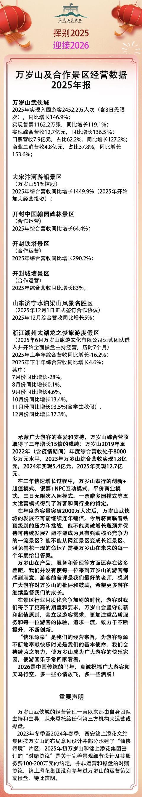 1月1日,记者从万岁山武侠城获悉,景区2025年度经营数据年报重磅发布,全年核心经营数据全线飘红,旗下控股及合作景区同步交出亮眼答卷,三年营收激增15倍的成绩成为文旅行业亮眼标杆。