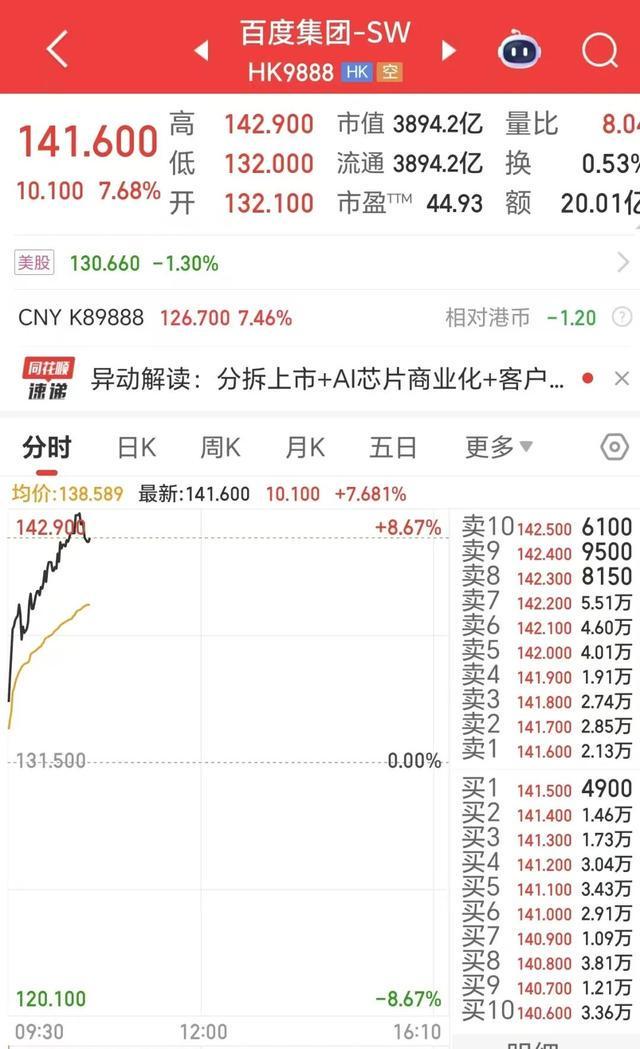 受此消息影响,百度集团港股当日大涨。截至发稿前,该股涨幅为7.68%,总市值为3894亿港元。