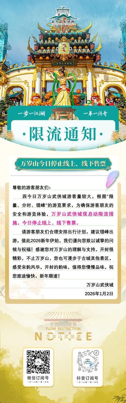 1月2日,开封万岁山武侠城发布限流通知:因今日万岁山武侠城客流量较大,根据“限量、分时、错峰”的游览要求,为确保游客朋友们的安全和游览体验,万岁山武侠城现启动限流措施,今日停止线上、线下售票。