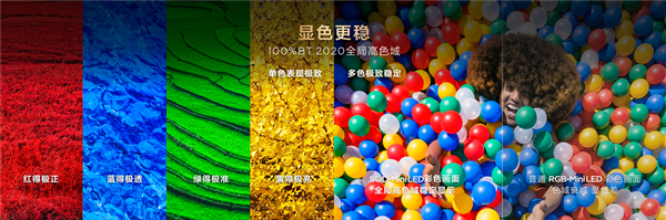 显示单色画面时,红得极正、蓝得极透、绿得极准、黄得极亮,每一种色彩都精准还原;显示多色复杂画面时,由于发光方式始终一致,色域值不会出现波动,色彩依旧纯净准确。