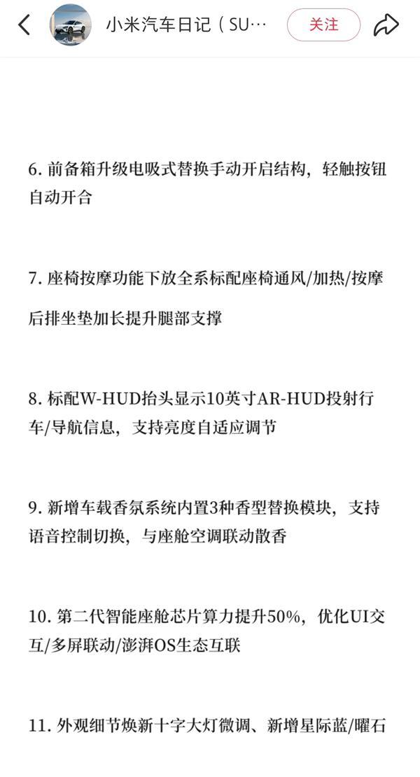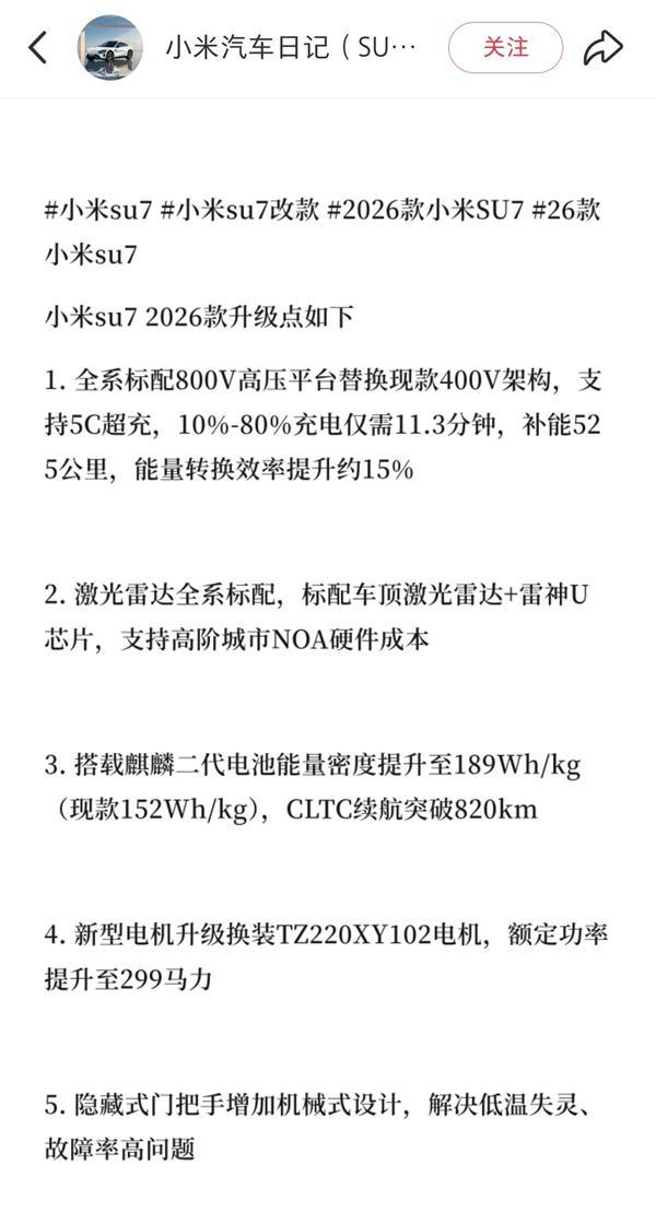值得一提的是,去年11月份,,知名汽车博主"韩路"就曾透露"独家小道消息"称,小米SU7换代2026年第二季度上市,升级颇多,但价格要涨2万。