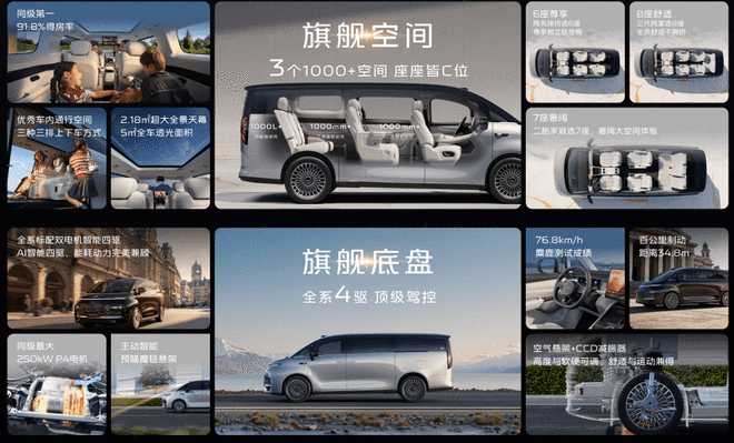 智能与安全配置方面,V900搭载Flyme Auto 2.0智能座舱系统与高通骁龙8295P芯片,集成AI大模型支持多方言交互;千里浩瀚H5高阶辅助驾驶方案配备27个感知单元,支持无图NOA领航与全场景智能泊车。安全防护上,全车配备11处环抱式气囊,3.1米贯通式侧气帘覆盖三排,配合全金属座椅背板,构建“三排安全平权”防护体系。