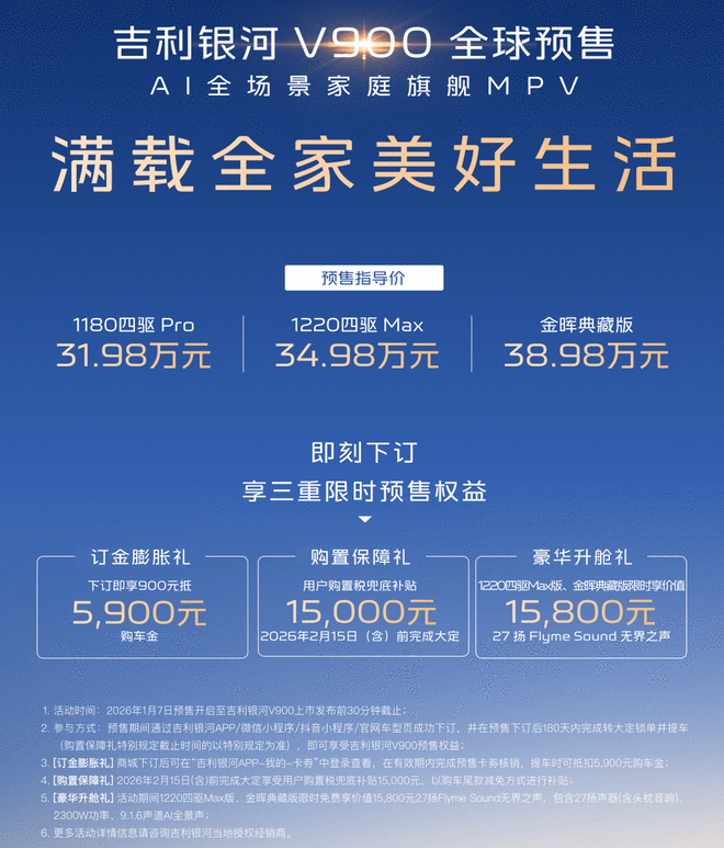 1月7日报道吉利银河品牌首款中大型MPV——银河V900正式启动全球预售,预售价31.98-38.98万。这款定位“AI全场景家庭旗舰MPV”的新车,基于GEA Evo全球智能新能源旗舰架构打造,以三排平权空间、超级AI增程技术及全场景智能配置为核心亮点,正式切入竞争日趋激烈的中高端MPV市场。