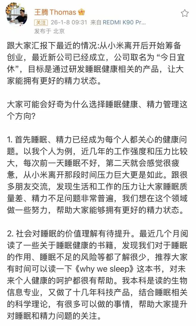 他表示从小米离开后开始筹备创业,最近新公司已经成立,公司取名为“今日宜休”,目标是通过研发睡眠健康相关的产品,让大家能拥有更好的精力状态。