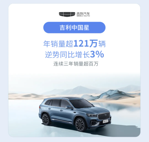 吉利汽车在燃油领域始终占据行业领先地位,吉利中国星年销量121万辆,连续3年销量超百万,同比增长3%。