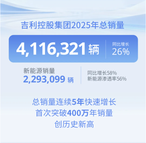 1月9日消息,今日,吉利控股集团公布2025年成绩,全球总销量4116321辆,同比增长26%。