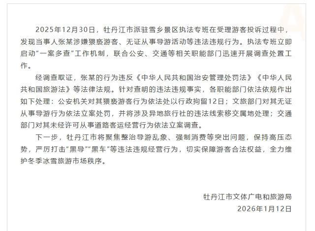 1月13日,牡丹江市文体广电和旅游局发布情况通报:
