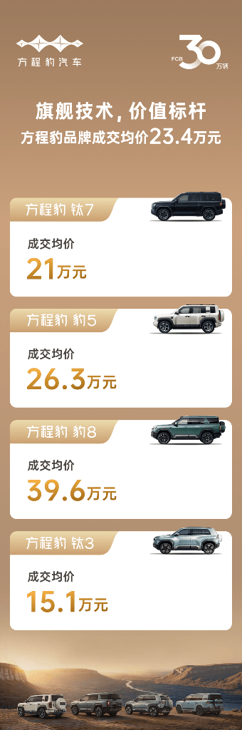 1月16日报道 日前,方程豹汽车宣布品牌累计销量突破30万辆,同时宣布钛7累计销量突破10万辆,这不仅印证了比亚迪个性化战略的成功,同样也是其高端化战略的成功。结合相关数据,方程豹品牌成交均价为23.4万元,钛7为21万元,豹5(参数丨图片)为26.3万元,钛3为15.1万元,豹8逼近40万,可见大多数用户购买的都是高配、甚至顶配的版本。另据悉,方程豹将于2026年正式推出轿跑系列,届时其产品线将以SUV、轿车2条线并行发展。