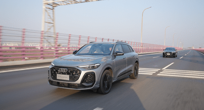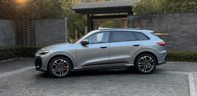 车身侧面延续Q5家族标志性的肩线设计,门槛至轮拱的上扬线条,使车辆在静态状态下依然呈现出向前俯冲的姿态。空间维度上,车身尺寸保持4842/1900/1660mm,轴距加长至2945mm,既保证了视觉协调,又为座舱空间奠定基础。半隐藏式电动门把手与20英寸轮毂搭配,进一步强化运动基因。