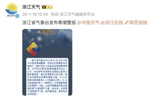 浙江天气今早已经发布寒潮警报:目前北方寒潮正在东移南下,预计明天上午起自北而南影响我省,日平均气温过程降温幅度可达8~11℃。20日浙中北和丽水北部的山区有小雨夹雪或雪,高山区局部有中到大雪,浙中北平原部分有雨夹雪或小雪。19日-21日我省沿海海面有8~10级偏北大风;19日-20日内陆地区有5~7级阵风,江河湖面和高山区局部8~9级。22日早晨最低气温大部地区-4~-1℃,有冰冻,山区-7~-4℃,有严重冰冻。