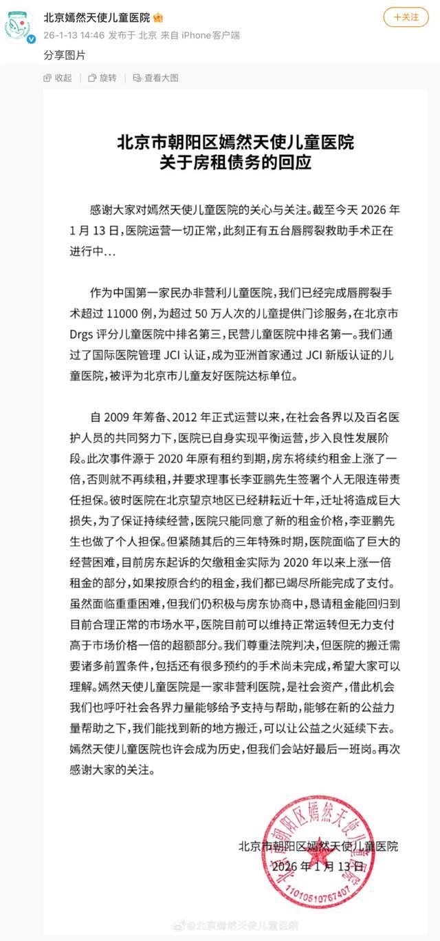 1月13日下午,@北京嫣然天使儿童医院 发布“北京市朝阳区嫣然天使儿童医院关于房租债务的回应”。