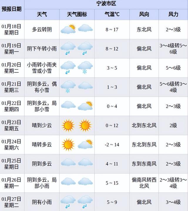 据宁波气象,寒潮将于明天正式来袭,下午起持续的降水上线,之后有雨雪相态转换,20日市区有望看到雪,不过积雪还是比较难。山区有小雨夹雪或雪并伴有积雪,21日偶有小雪,22日局部小雪。