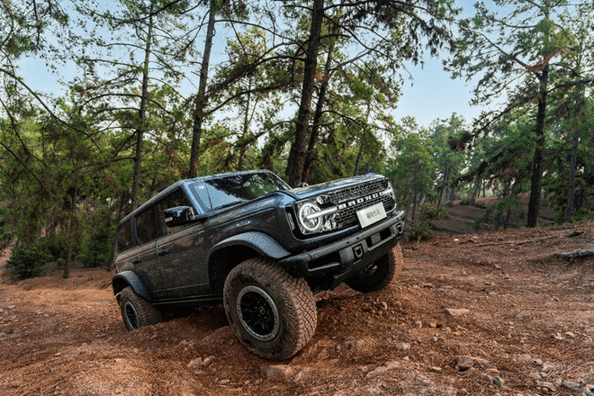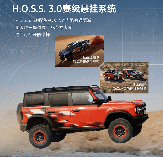 越野性能方面,新款烈马依然是原厂标配固特异35英寸外径泥地胎,尺寸为LT315/70 R17,搭配17英寸高亮喷黑铝合金越野防脱轮毂和宽体大轮眉套件。而且所有大脚越野版本均拥有4.7后桥速比、德纳DANA前/后电控机械差速锁、EMOD智能预加载四驱、H.O.S.S. 2.0悬挂系统带Bilstein倍适登三段式氮减,在很大程度上诠释了越野的高性能要求。此外还配备了独有的G.O.A.T. 全地形智能管理系统,既致敬了初代车型的代号,更寓意福特烈马能够“征服任何地形”。提供7种驾驶模式,能够随不同越野场景进行智能切换,而且独有的BAJA模式能够来赛事级越野体验感,G.O.A.T.全地形智能管理系统可对ESP/差速锁/防倾杆/TCU/ECU等模块进行介入,堪称越野专家帮您开车。