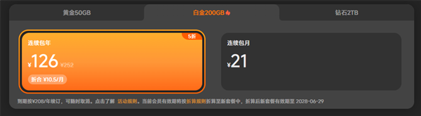其中,50GB连续包年36元,折合每月3元;200GB连续包年126元,折合每月10.5元;2TB连续包年408元,折合每月34元。