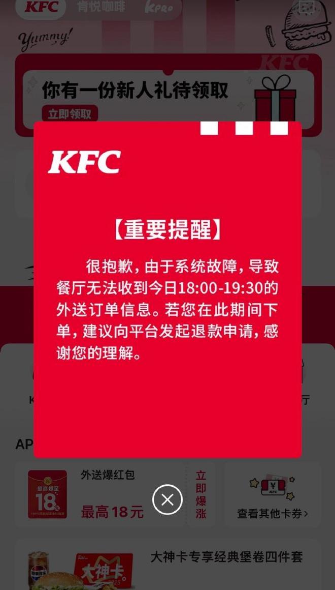 肯德基外送系统崩溃,顾客需通过平台申请退款解决问题