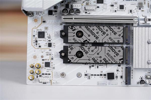 存储方面,主板提供4个M.2插槽,包括2个PCIe 5.0 x4接口与2个PCIe 4.0 x4接口,均配备冰霜铠甲辅助散热。另提供2个SATA 6Gbps接口,满足多存储设备接入需求。