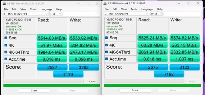 左边是1GB容量的测试。在AS SSD Benchmark的测试中,PC42Q 1TB得分为7170分。顺序读写速度分别为5514MB/s、5538MB/s,4K读写速度则是51MB/s、234MB/s。