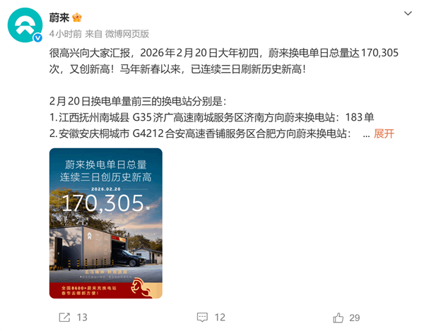 2月21日消息,蔚来汽车官方宣布,2月20日大年初四,蔚来换电单日总量达170,305次,又创新高,马年新春以来,已连续三日刷新历史新高。