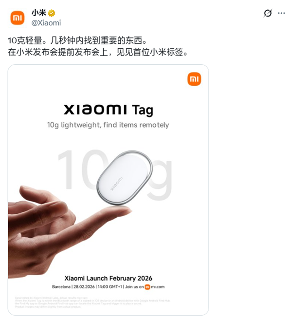2月23日消息,小米海外官方账号发文宣布,小米Tag追踪器将于2月28日发布,与小米17系列等同台在海外登场。