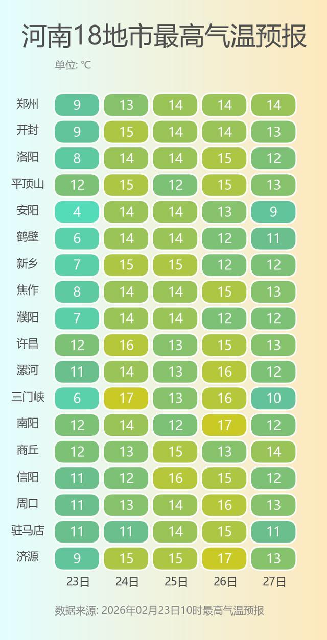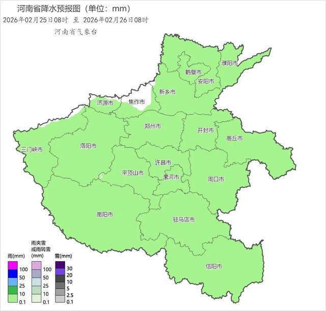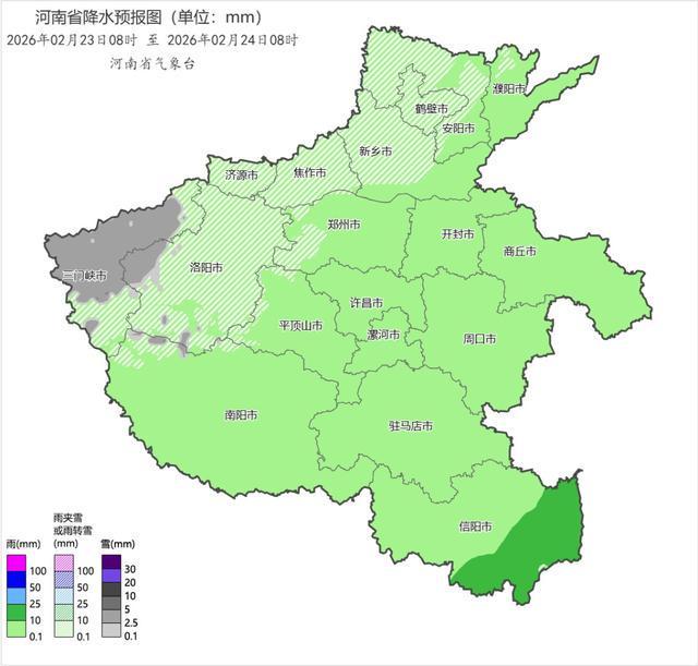 今天下午到夜里,全省阴天,黄河以北和三门峡、洛阳、郑州北部小雨转雨夹雪或小雪,其中高海拔山区有中雪;其他县(市、区)有小雨或零星小雨,其中南阳东部、驻马店、信阳部分县(市、区)有中雨。全省东北风3到4级,阵风6级左右,浮尘自北向南减弱消散。