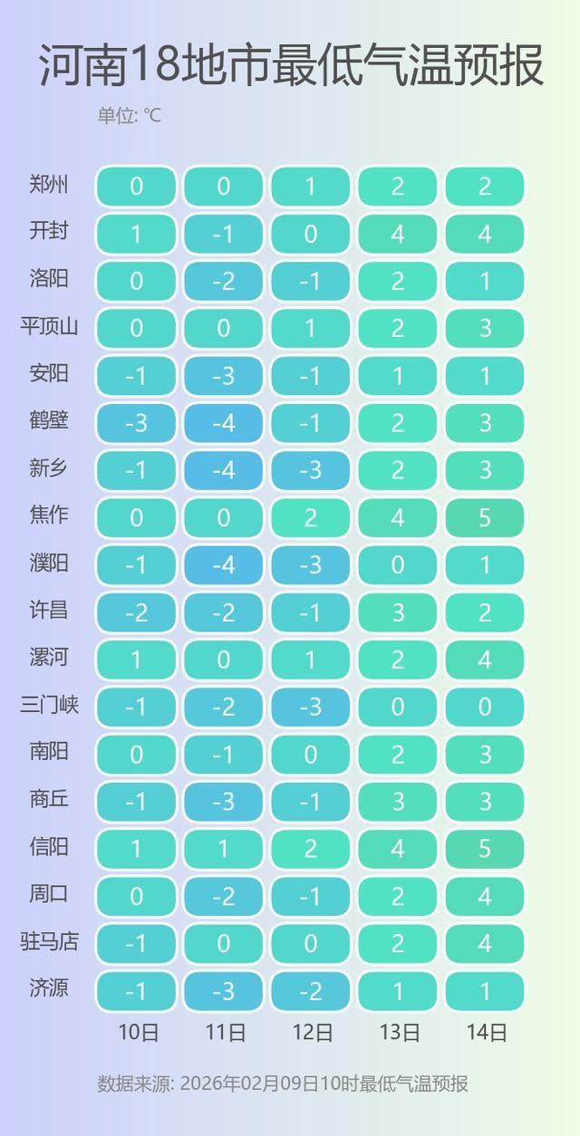 明天起升温通道将再次开启,24-26日多地最高气温在14-16度小幅波动。未来五天最低气温波动回升,但上升幅度较小,仍在0度左右,早晚仍要注意保暖。