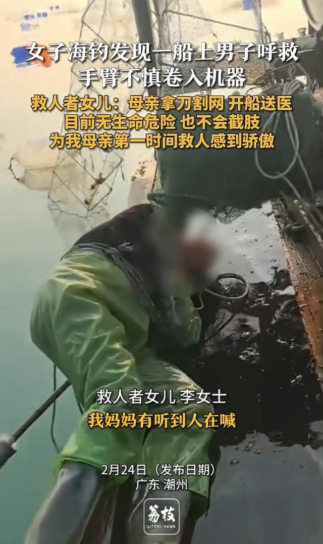 近日,广东潮州,女子 海钓发现不远处的船上有男子呼救,其手臂不慎卷入机器,立刻施救。