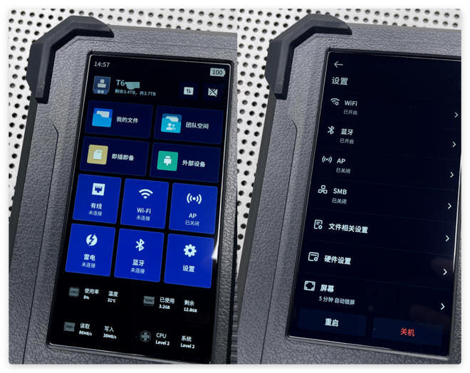 T6在便携性上做到了高度平衡实用与体积。机身小巧,可轻松放入背包、行李箱,搭配专属手提袋,外出携带更方便。机身四角配备防磕碰缓冲设计,在旅途颠簸中也能有效保护设备。它自带5.99英寸高清触控屏,无需连接显示器、不用依赖手机APP,就能直接预览照片、查看视频、操作备份,非常适合户外、车内、民宿等无电脑场景。内置电池支持UPS安全关机,即使突发断电,也能保护硬盘与数据安全,彻底解决出行途中的供电焦虑。