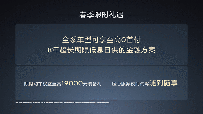 此外,官方同步推出春季限时礼遇,全系车型可享至高0首付,8年超长期限低息日供的金融方案,以及夜间试驾随到随享、限时购车权益至高1.9万元装备礼。