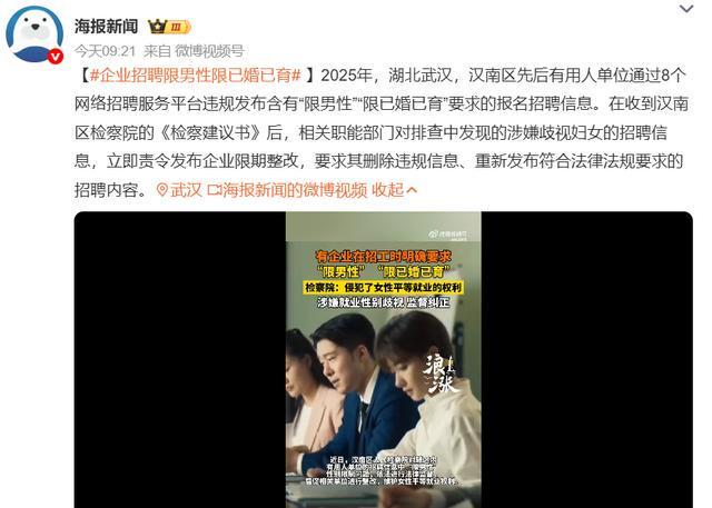 2025年12月,汉南区检察院向经开区的相关部门制发了《检察建议书》,要求相关职能部门对全区网络招聘平台开展“拉网式”排查,24小时内完成全部含性别歧视内容招聘信息的删除工作,并建立问题台账动态管理,维护妇女平等就业权。