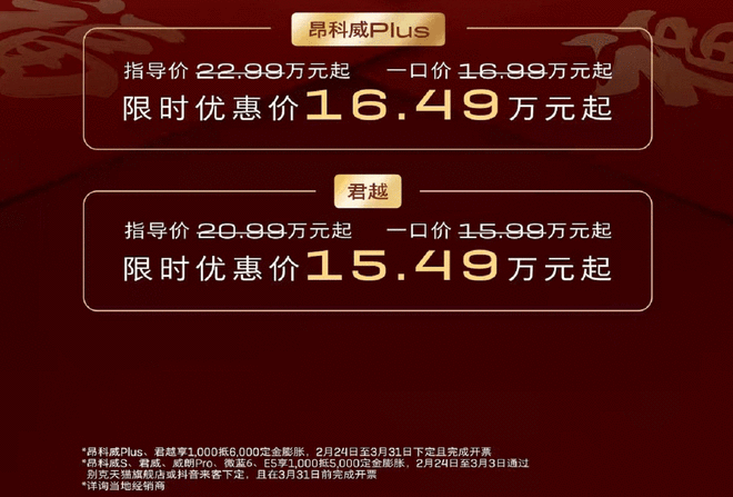 2月26日报道 日前从官方获悉,上汽通用汽车别克品牌宣布开启“百亿大红包”开年福利。即日起至3月31日,购买别克昂科威Plus(参数丨图片)和君越享1000元抵6000元订金膨胀,君越限时优惠价为15.49万起,昂科威Plus限时优惠价16.49万起。同时,从即日起至3月3日完成下订且在3月31日前完成开票,选择昂科威S、君威、威朗Pro、微蓝6以及别克E5可享受1000元抵5000元订金膨胀。