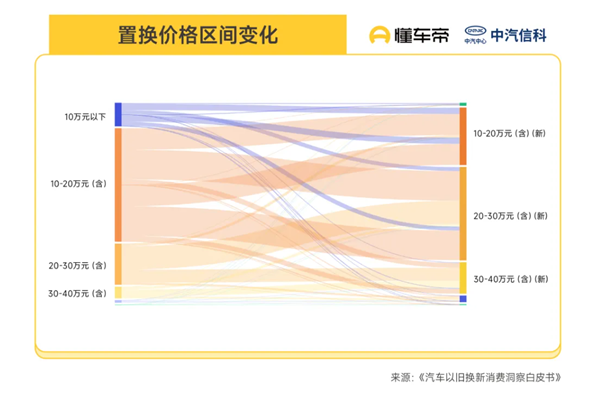 数据显示,59%的车主置换前的旧车价格在15万元以下,而置换后,74.1%的用户选择了20万元以上的新车,20-30万元成为最受欢迎的价格区间。
