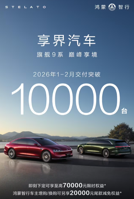 享界汽车:2月累计交付4627台,2026年已交付超10000台 访客 2026-03-03 16:52:00 9824 抢沙发 默认 3月3日消息,鸿蒙智行官方公布了享界汽车的交付情况,2月交付4627台,2026年1-2月累计交付突破10000台。 标签: 鸿蒙 消息 海报 阅读 QQ 分享 微博分享 微信分享 分享 上一篇百度智能云技术委员会主席孙珂离职,加盟京东大模型团队 下一篇QM发布2025年AI应用榜:豆包去年12月月活2.26亿 百度智能云技术委员会主席孙珂离职,加盟京东大模型团队上一篇 QM发布2025年AI应用榜:豆包去年12月月活2.26亿下一篇 相关推荐 鸿蒙消息 元宝派新升级,@元宝便可直接P图 2026-03-06 余承东:吹过的牛实现了!896线激光雷达上车 尊界S800和问界M9首搭 2026-03-05 鸿蒙智行首款猎装车 尚界Z7/Z7T首发 年轻人的出街神车! 2026-03-05 仅用43个月!鸿蒙智行创中国造车新势力最快交付破百万台纪录 2026-03-04 全新问界M6更多信息:乾崑智驾ADS4.0+鸿蒙座舱5.0 2026-02-18 鸿蒙智行起诉自媒体「我是大彬同学」获法院判决:赔偿150万元 2026-02-11 自媒体“我是大彬同学”被判赔鸿蒙智行150万 2026-02-11 微信iOS8.0.69正式版:视频通话新增屏幕锁定功能,聊天消息支持语音播报 2026-02-09 发表评论取消回复 快捷回复: 评论列表 (暂无评论,9824人围观)参与讨论 还没有评论,来说两句吧...