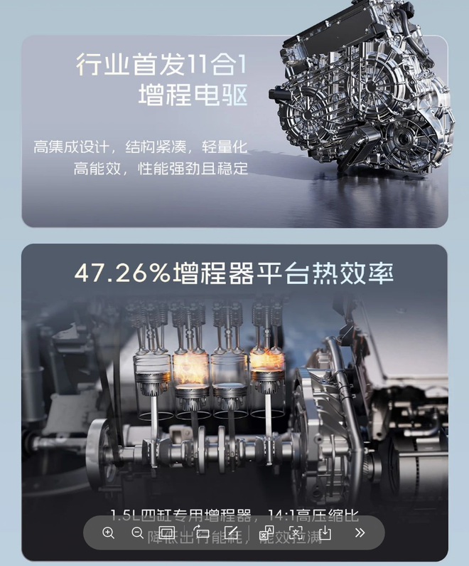 首先,长续航,低能耗:配备行业首发的11合1智能增程系统,发动机、电机和变速器等高度集成,可实现47.26%的增程平台热效率,既减轻车身重量,又进一步降低能耗;50度大电池,CLTC纯电续航375km,综合续航高达1525km;