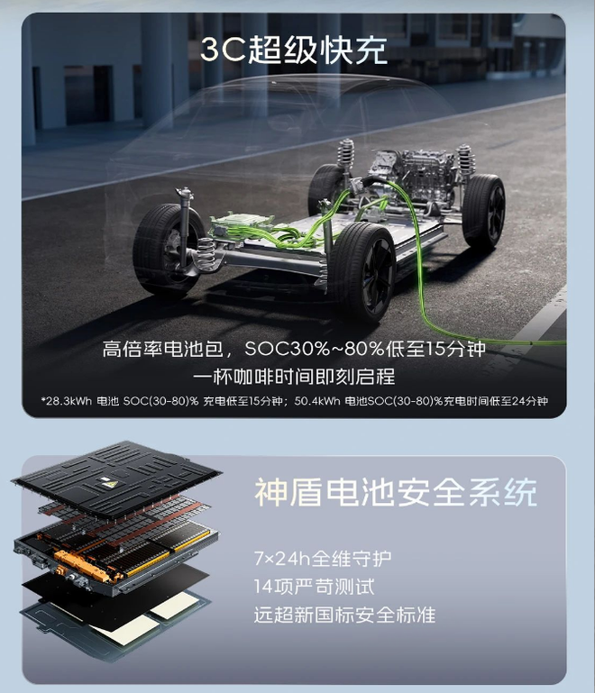再次,超安全,超快充:配备3C超级快充,50.4KWh容量电池,SOC30%~80% 低至24分钟;神盾电池安全系统远超新国标;即便在-30℃深寒、50℃高温等极端温区,充电依旧稳定,6KW超大功率放电的功能,可满足更多使用场景;