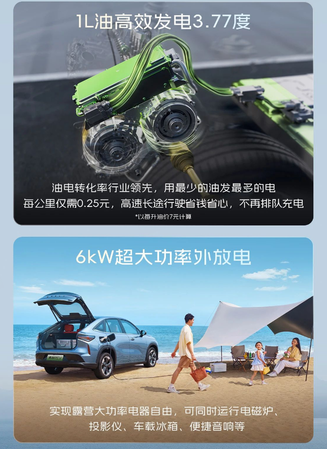 最后:超节能,超省钱:该车发电油电转换比可高达3.77度/L,每公里仅需0.25元,高速长途行驶省钱更省心;WLTC馈电油耗低至4.95L/100km,馈电状态下最大放电功率180kW,兼顾节能与续航。