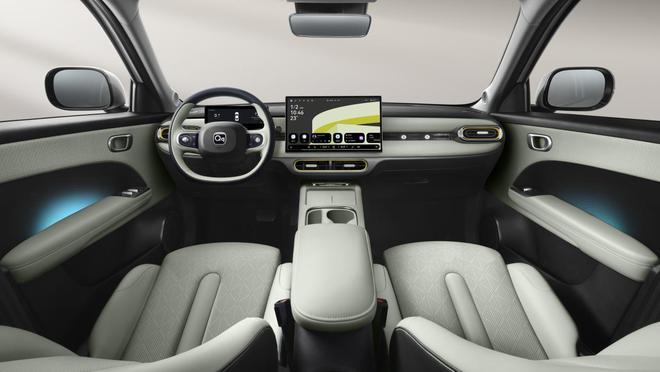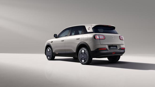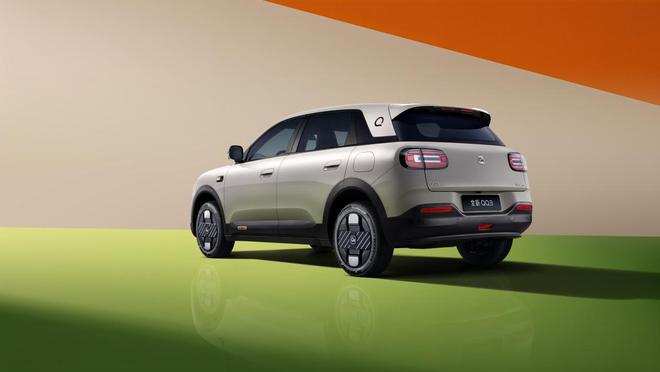 全新QQ3 EV的外观由曾获红点设计奖的团队操刀,官方称之为“智圆行方”理念。前脸采用封闭式格栅,Q型LED大灯与下方的圆角贯穿式进气口形成横向延伸,视觉上压低了车头重心。车身侧面最值得留意的其实是比例——0.643的轴长比、2.39的轮高比、3倍轮轴距,这套数据落在实车上,呈现出来的是短悬长轴特有的舒展姿态,没有传统小车那种“头重脚轻”的局促感。