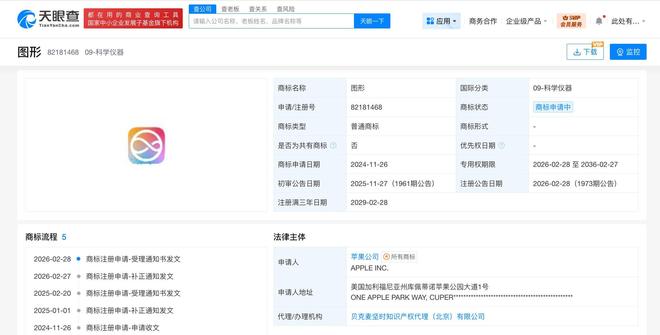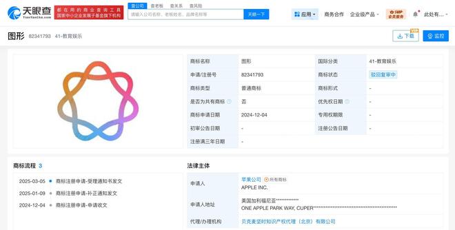 据天眼查知识产权信息显示,2024年,苹果公司已在中国申请注册多枚苹果智能相关图形商标,国际分类涉及网站服务、教育娱乐、科学仪器等,当前多枚商标已被驳回复审,部分商标状态为初审公告。