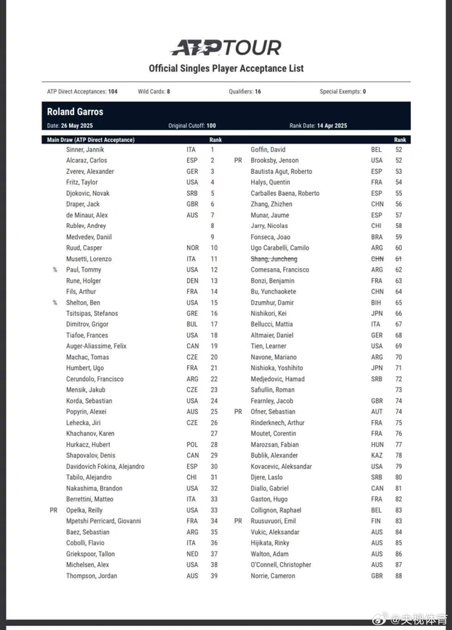 据法网官方,本届比赛卫冕冠军阿尔卡拉斯、斯瓦泰克,男女单世界排名第一辛纳、萨巴伦卡,传奇球星德约科维奇等球员悉数在列。