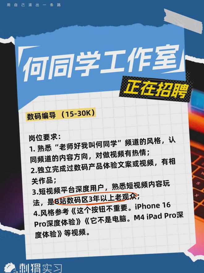 数码编导职位要求:熟悉“老师好我叫何同学”频道的风格,认同频道的内容方向,对做视频有热情;独立完成过数码产品体验文案或视频,有相关作品;短视频平台深度用户,熟悉短视频内容玩法,是B站数码区3年以上老观众。