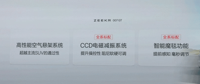 底盘方面,007GT采用前双叉臂+后多连杆独立悬架,并标配空气悬架系统,支持5档车身高度调节,兼顾运动操控与舒适性。