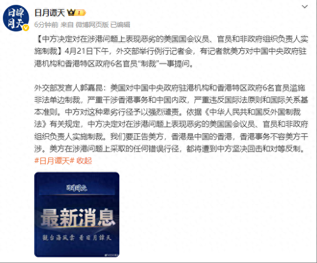 4月21日下午,外交部举行例行记者会,有记者就美方对中国中央政府驻港机构和香港特区政府6名官员“制裁”一事提问。
