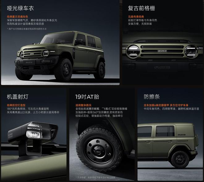 V23方正硬朗的车身轮廓搭配哑光绿车衣,奠定了硬派的基调;复古前格栅在复刻经典造型的同时优化进气设计,提升电机散热效率;机盖射灯严格遵循前大灯规格开发,通过防雾防眩光灯罩强化恶劣天气下的穿透性照明,为越野场景提供可靠保障;车身防擦条选用高韧性材质打造外扩式立体造型,以熏黑工艺提升视觉张力,有效抵御碎石剐蹭与植被摩擦;19吋AT全地形轮胎则通过全宽胎面减震层与强化胎体结构,兼顾复杂路况的抓地力与日常驾驶的舒适性,展现硬核性能与细节美学的平衡。每一项配置都经过严苛的工业验证,确保了改装套件在品质与审美上的双重卓越。