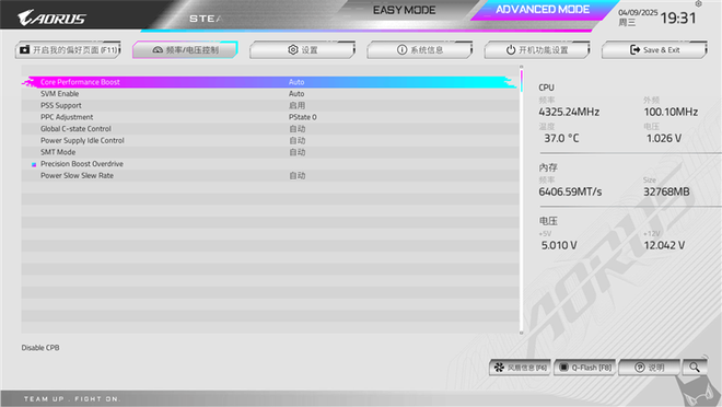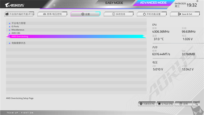技嘉B650E冰雕背插主板BIOS的设置页面中,提供了更多设置,也包括AMD更详细的超频设置选项。