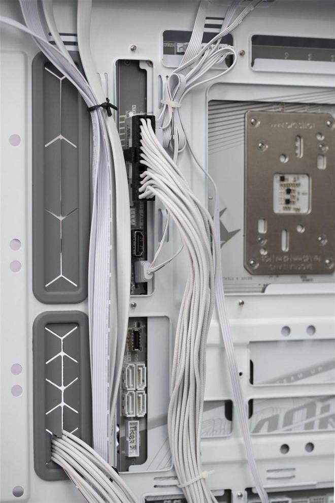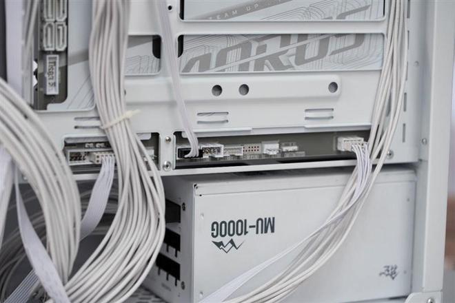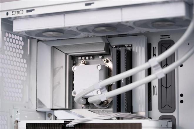 机箱正面确实极为整洁,只有散热器水泵的管线和显卡的供电线目前仍无法避免,其余所有的线都隐藏在背面看不到。