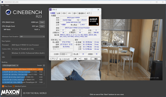 CINEBENCH R23测试,CPU单核成绩2251,多核成绩42804。