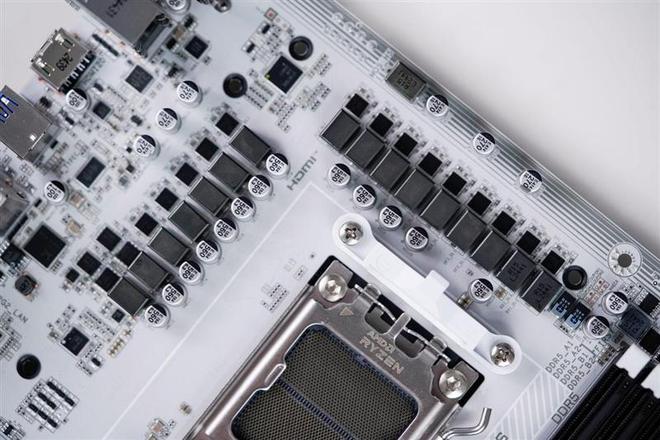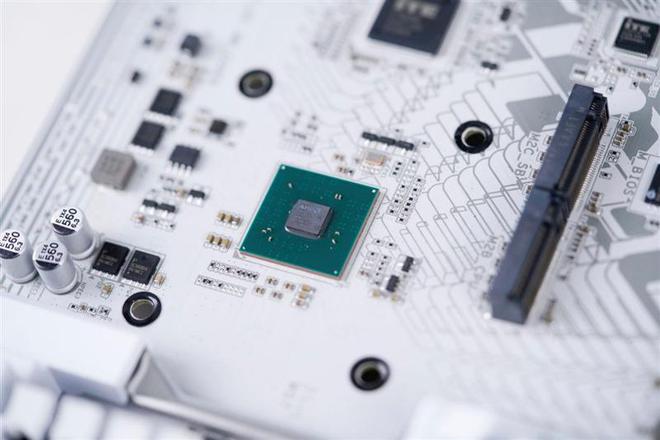 技嘉B650E冰雕背插主板芯片组芯片特写。