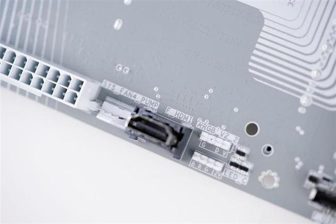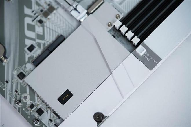 主板芯片组芯片有额外的散热片覆盖,通过磁吸触点对超大散热装甲内部隐藏的灯光供电。